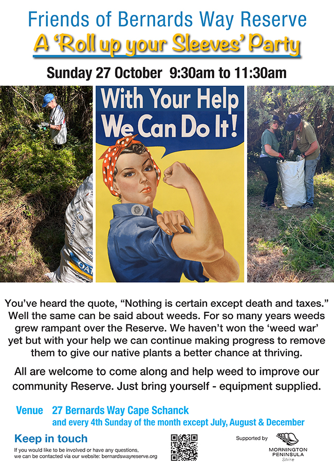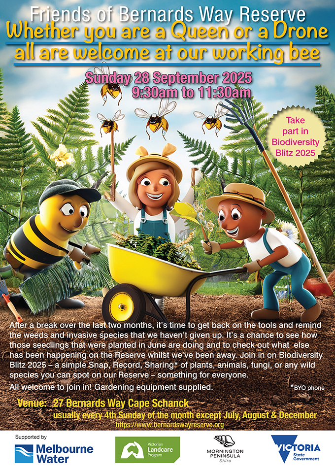 Examples of our advertising poster is shown below. The advertising for the next working bee is normally posted about a week before the event together with a letterbox drop to a number of local homes. A poster is displayed in the school bus shelters in Bernards Way and Cape Schanck Road.